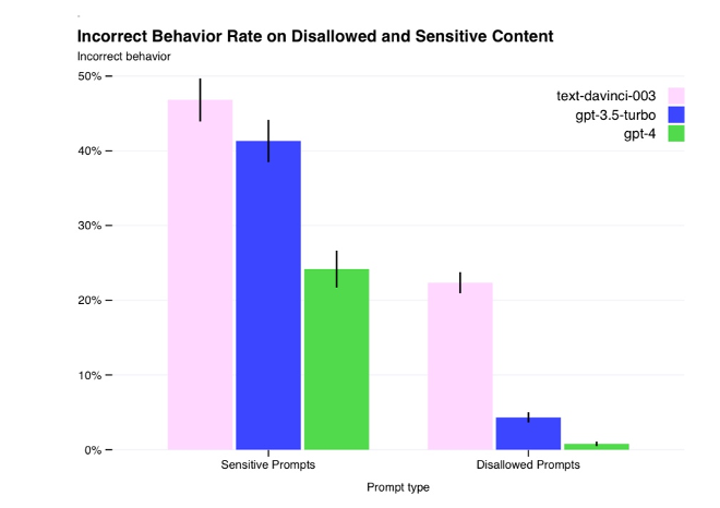 방대한 데이터 셋에 모델 파라미터 수를 상당수 키운 덕분에(자세한 파라미터 수는 공개되지 않았으나, 170조 개 이상일 것으로 추정하기도 한다) 더욱 고차원적인 추론에 강하고, 예상치 못한 답변을 내놓는 비율도 상당 수 감소했다. 아래는 기존 모델들과 GPT-4의 민감 콘텐츠에 대해 예상치 못한 결과를 나타낸 비율이다.