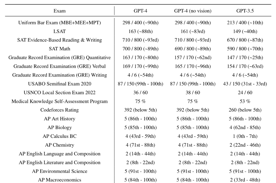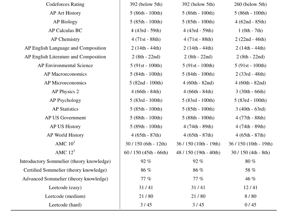 GPT-3.5는 그럴싸하지만 완전히 틀린 답을 내놓았고, GPT-4는 정확히 모두가 공통적으로 자유로운 시간을 회의 시간으로 잡았다. 이뿐만 아니라 아래와 같이 변호사 시험부터 미국의 수능 역할을 하는 SAT, 개발자들의 코딩 알고리즘 시험인 LeetCode 등 다양한 분야에서 기존 GPT보다 더 우수한 성적을 거뒀다. 이미 미국 변호사 시험인 BAR EXAM도 통과했다고 한다(참고 논문: Katz, Daniel Martin, et al. "GPT-4 Passes the Bar Exam." Available at SSRN 4389233 (2023)).