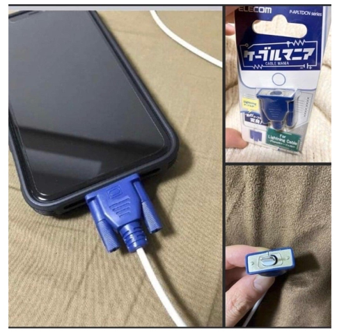 패널 1: 스마트폰의 충전 포트에 VGA 커넥터(일반적으로 컴퓨터 모니터에 사용되는 커다란 파란색 15핀 커넥터)가 꽂혀 있습니다.