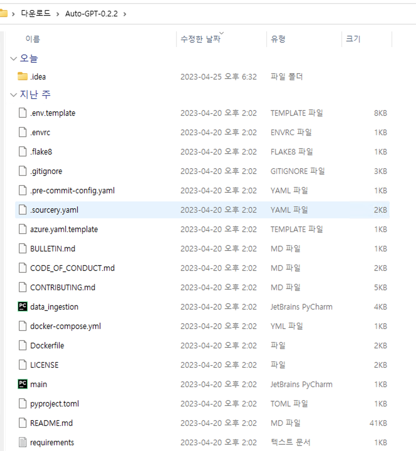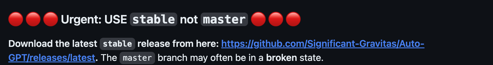 현재는 https://github.com/Significant-Gravitas/Auto-GPT/releases/tag/v0.2.2에서 stable 버전을 받는 것이 더욱 안정적이라고 설명하고 있으니 우리도 여기서 받도록 하자.