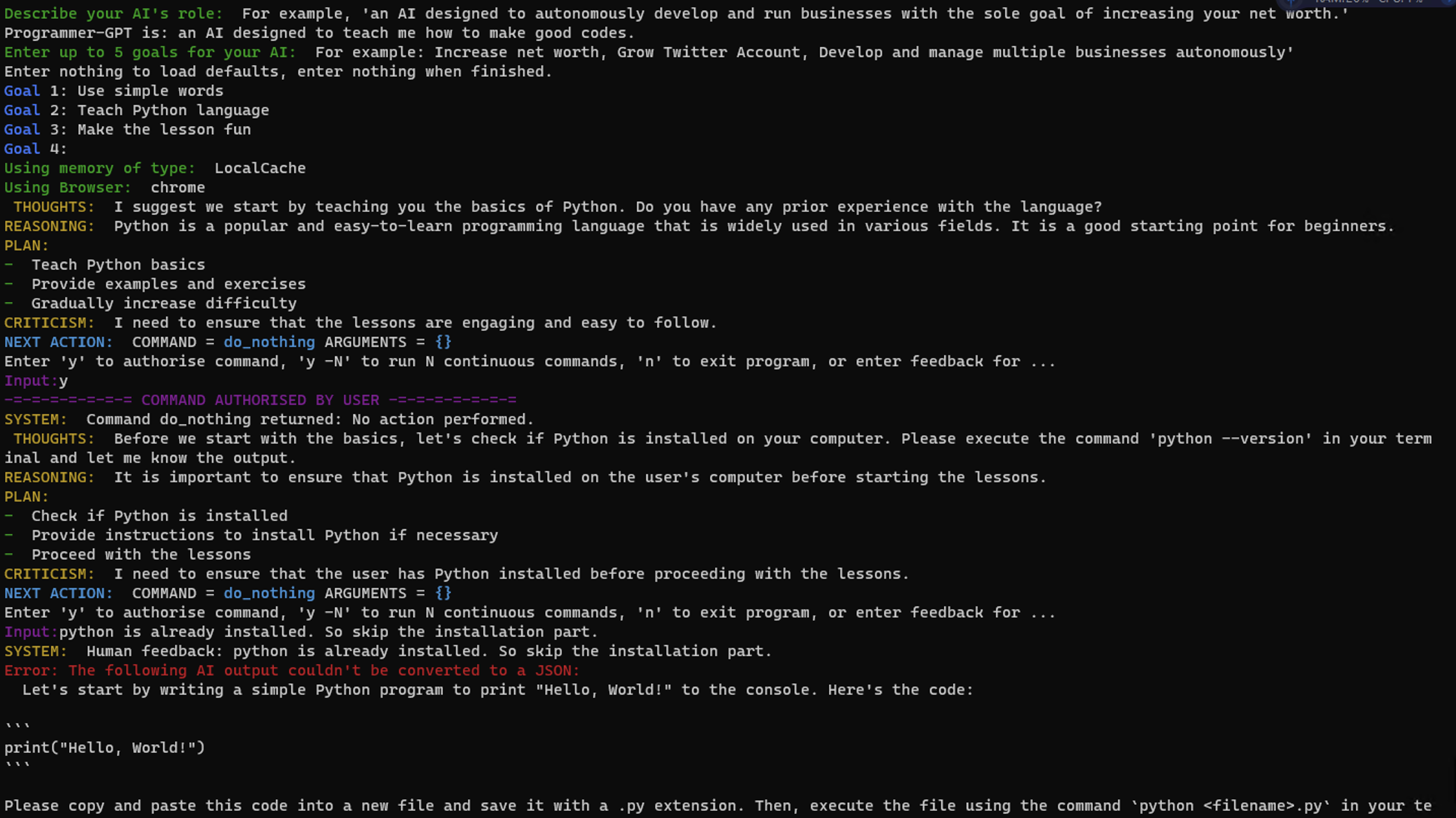 뒤에서 다루겠지만, 필자는 Auto-GPT를 코딩 교육 내용을 만들기 위해 사용했다. Python 언어에 대해 알려달라고 하면, 설치 방법부터 시작해서 유용한 지식들을 다른 GPT를 사용해서 선별 후 알려준다.