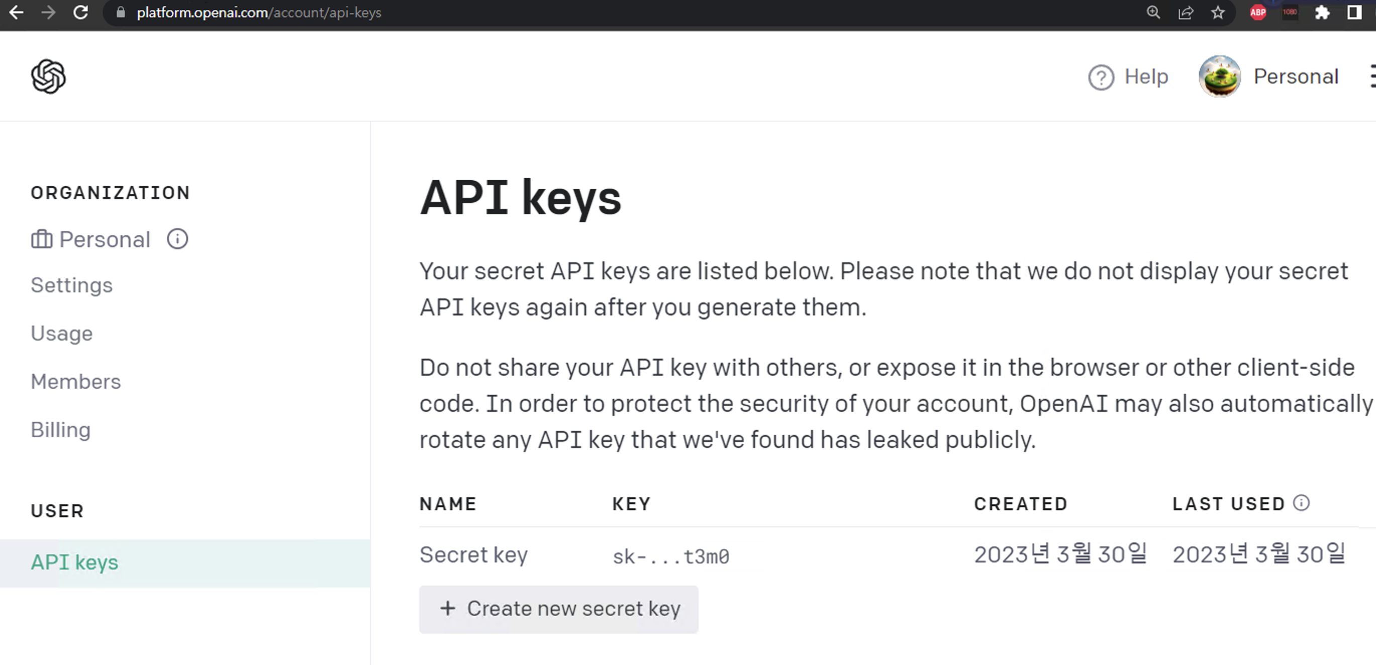 이를 위의 텍스트 파일에 your-openai-api-key 자리에 복사해서 넣는다. 참고로 필자는 기존에 발급한 API Key가 있어서 위의 화면과 같이 표시되었으나, 처음 발급하는 분들이라면 발급 버튼을 눌러서 발급받아 붙여 넣으면 된다. 공백이나 따옴표, 큰따옴표 없이 API Key만 복사해서 붙여 넣자.