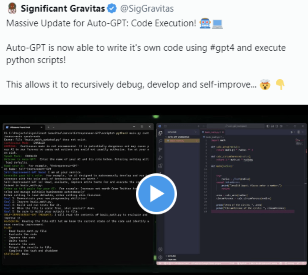 Auto-GPT 개발자가 쓴 트윗이다. 오토 GPT로 수학 계산 함수의 검증 작업을 Auto-GPT로 수행하는 동영상을 올렸다고 한다..!