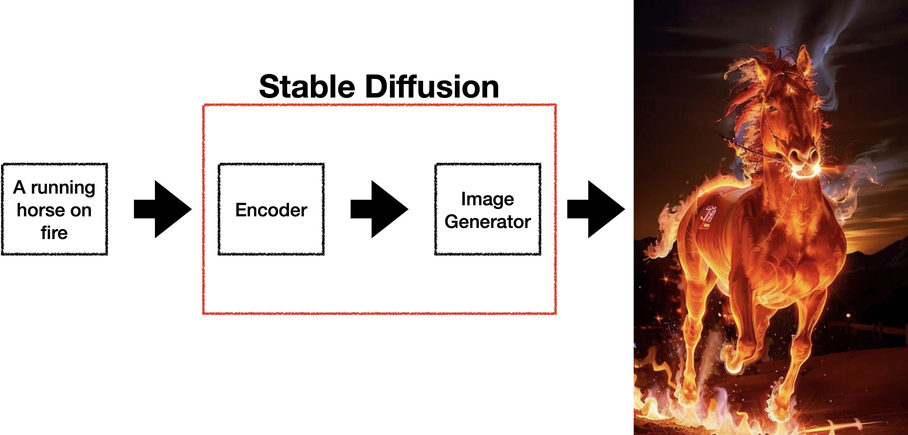 바로 위와 같이 텍스트를 입력하면 이를 해석해서 그림으로 생성해주는 능력이 매우 강력하기 때문이다. 뿐만 아니라, 모델이 매우 경량화되어 일반 그래픽카드 수준의 VRAM으로도 이미지 생성이 가능하다는 점도 한몫했다. 위의 기능은 text to image 기능이지만, image to image나 inpaint와 같이 입력을 이미지로 할 수도 있다. 예를 들면 위의 불타는 말 그림에 추가 텍스트로 'Flying'을 붙이면 불타는 말이 하늘을 나는 그림이 나타난다.