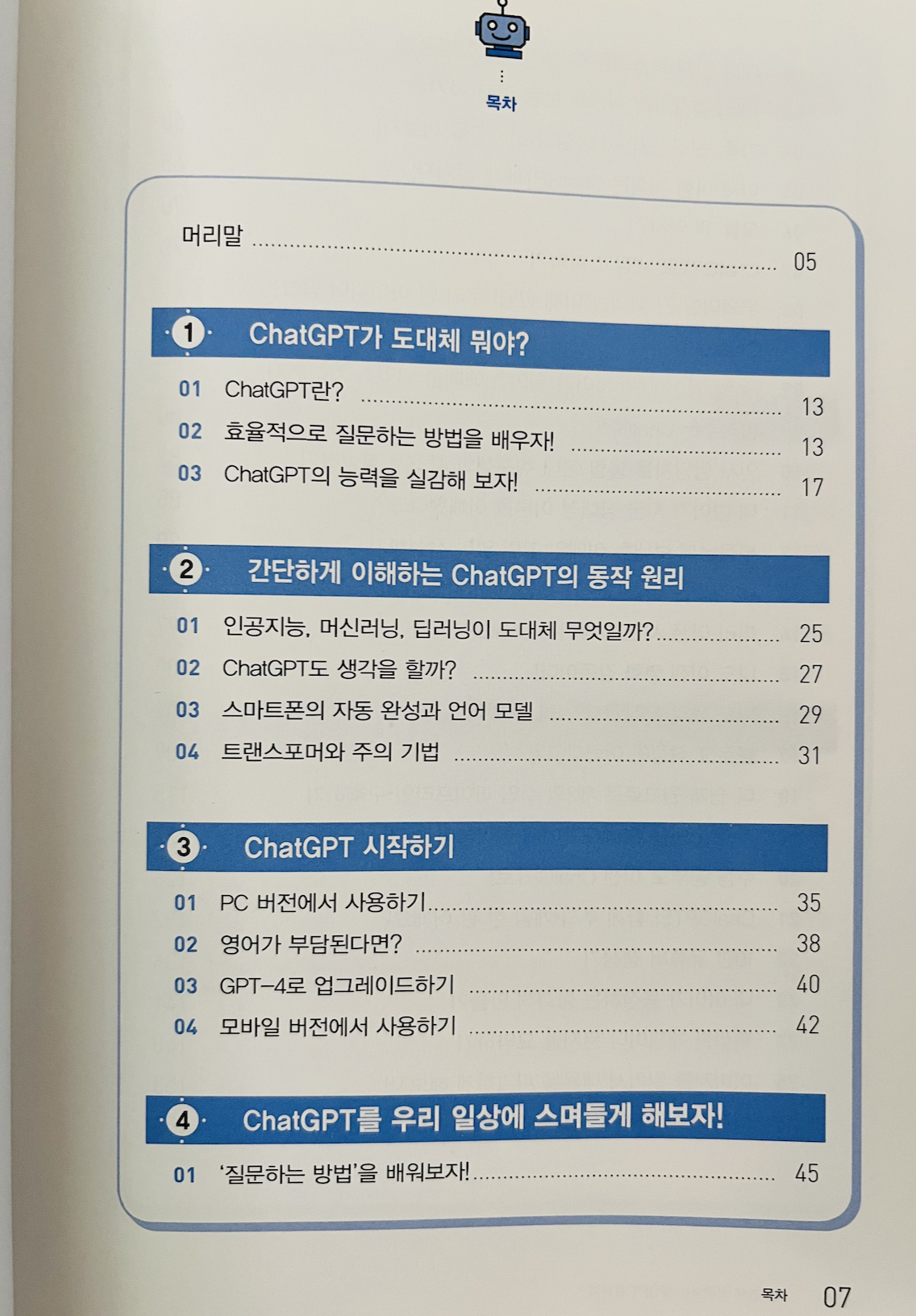 이번에 출간된 책은 일반인을 대상으로 하는 '하루 만에 이해하는 챗GPT 활용법'이다. 출판사에는 GPT-4가 반영되었다는 이야기를 전했는데, 살짝 혼선이 있었는지 'ChatGPT4'라고 적힌 점은 조금 아쉽다. 실제로 ChatGPT는 서비스고, GPT-3.5, GPT-4 등이 모델이기 때문에, GPT-4 버전 반영이 차라리 맞다. 버전 차이에 따라 사용자가 느끼는 차이는 얼마나 대화를 더 자연스럽게 하며, 사용자가 원하는 대답을 잘하는지이므로, GPT-3.5와 4의 버전 반영이 명시적으로 특정 기능을 반영하는 것은 아니지만, 이번 책에서는 대부분 GPT-4를 사용한 응답을 주로 수록하였다.