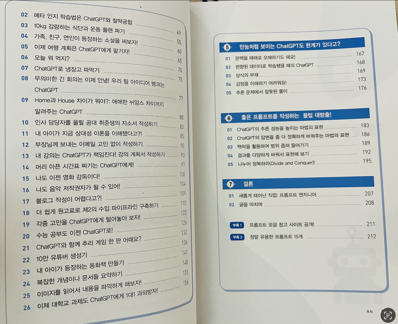 이번 일반인을 위한 ChatGPT 책은 가장 중점적으로 '어떻게 프롬프트를 작성해야 하지?'라는 질문에 대한 답을 하는 것을 목적으로 했다. 사실 수많은 플러그인들, 익스텐션들을 설치하면 프롬프트를 제안해 주거나, 특정 목적의 프롬프트들이 이미 구성되어 있어 사용하기 편하지만, 이 역시 어떤 사용 예제들이 있는지를 알아야 떠올릴 수 있을 것이다. 때문에 이번 책에서는 교육, 운동, 식단, 소설작성, 여행 계획, 음식 메뉴, 아이디어 제안, 언어 공부, 자소서 작성, 메일 작성, 강의 계획서 작성, 시간표 짜기, 영화 시나리오 생성, 작곡, 블로그 작성, 도서 출판, 고민 상담, 수능 공부, 추리 게임 플레이, 유튜브 제작, 동화책 제작, 개념과 문서 요약, 이미지 읽어서 요약, 대학 과제 수행 예제 등 25가지 이상의 예시들을 수록했다. 모두 ChatGPT 질문과 답변을 함께 담아서, 실제로 따라서 질문을 해볼 수도 있고, 이를 활용해서 다양한 질문들로 응용할 수 있는 능력을 기를 수 있게 구성했다.